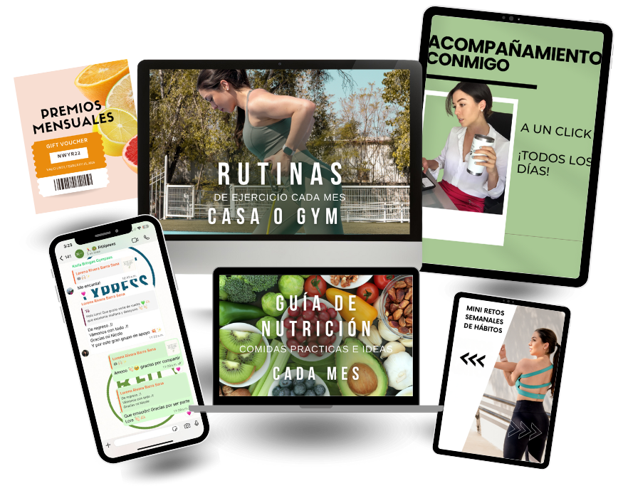 Es un plan de 6 meses de acompañamiento y guía para que logres mejorar hábitos paso a paso, e incluye: una guía de nutrición mensual con menús semanales y recetas deliciosas (renovada cada mes), rutinas flexibles y adaptables de 30 min en casa o gym, acceso a la comunidad exclusiva de WhatsApp conmigo ahí para apoyarte, mini retos semanales y premios mensuales para los participantes